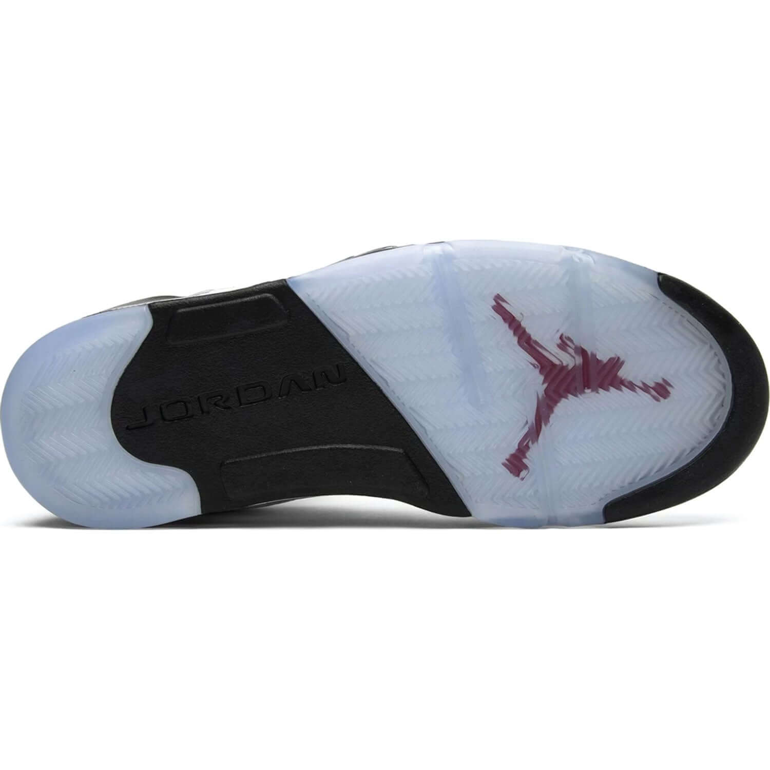 The Air Jordan 5 Retro 'White Cement' features a white leather upper with speckled Cement Grey accents at the midsole and upper eyelets. Released in August 2017, the sneaker also comes with a translucent ice-blue outsole, 3M reflective black tongue, and University Red Jumpman.