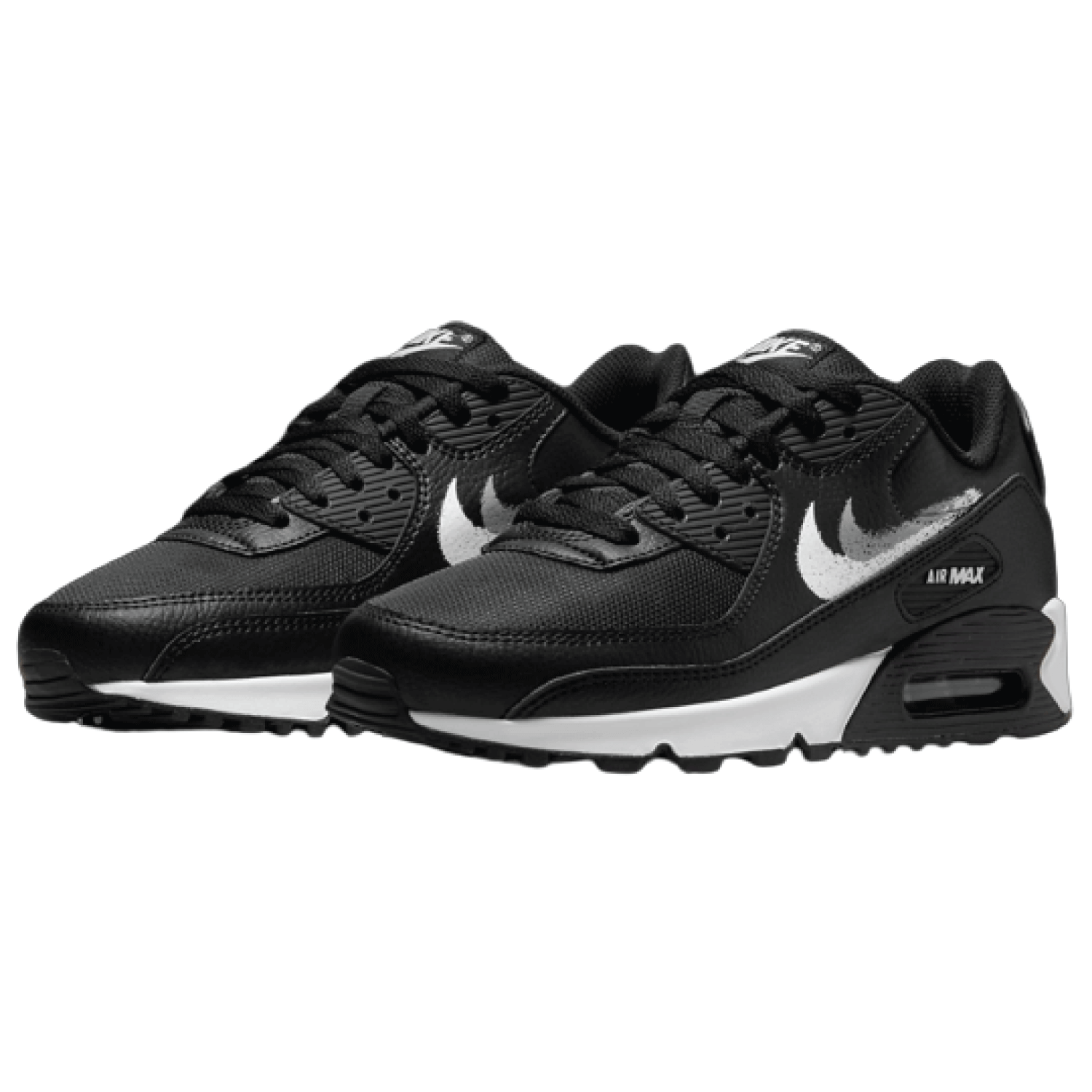 This offering of the Air Max 90 features an all-Black upper constructed in a mix of leather and mesh materials. White branding and midsole highlighted with two spray-painted brush Swooshes on the sides complete the design.