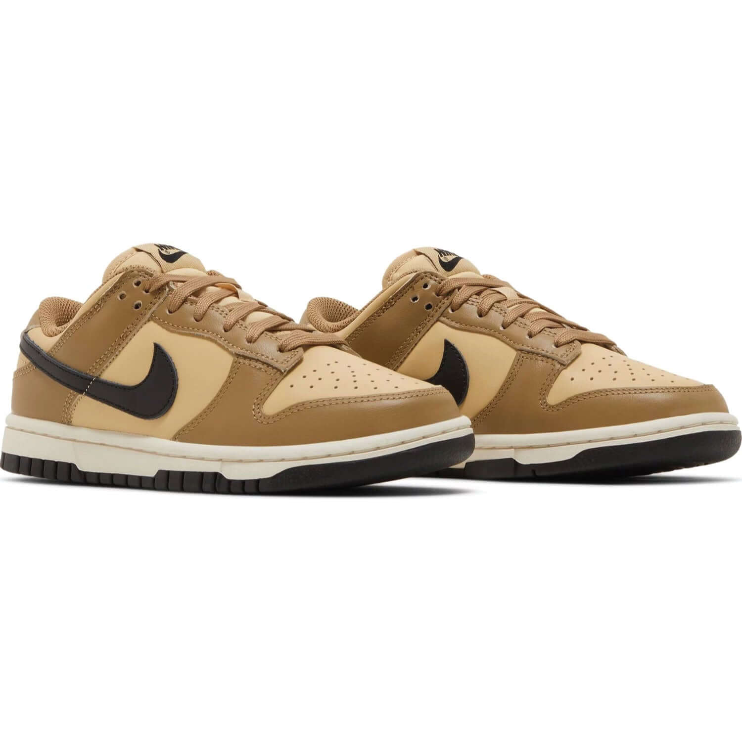 The Swoosh on the Dunk Low Dark Driftwood is white, as are the laces and the logo on the tongue. This low-top sneaker has a full leather construction with a mocha-brown base color that’s complemented by a lighter overlay around the heel, where the laces go through and around the toe. The Dunk Low Dark Driftwood sole matches the lighter hue on the overlays, but it also has a white highlight between the base of the sole and the shoe itself.