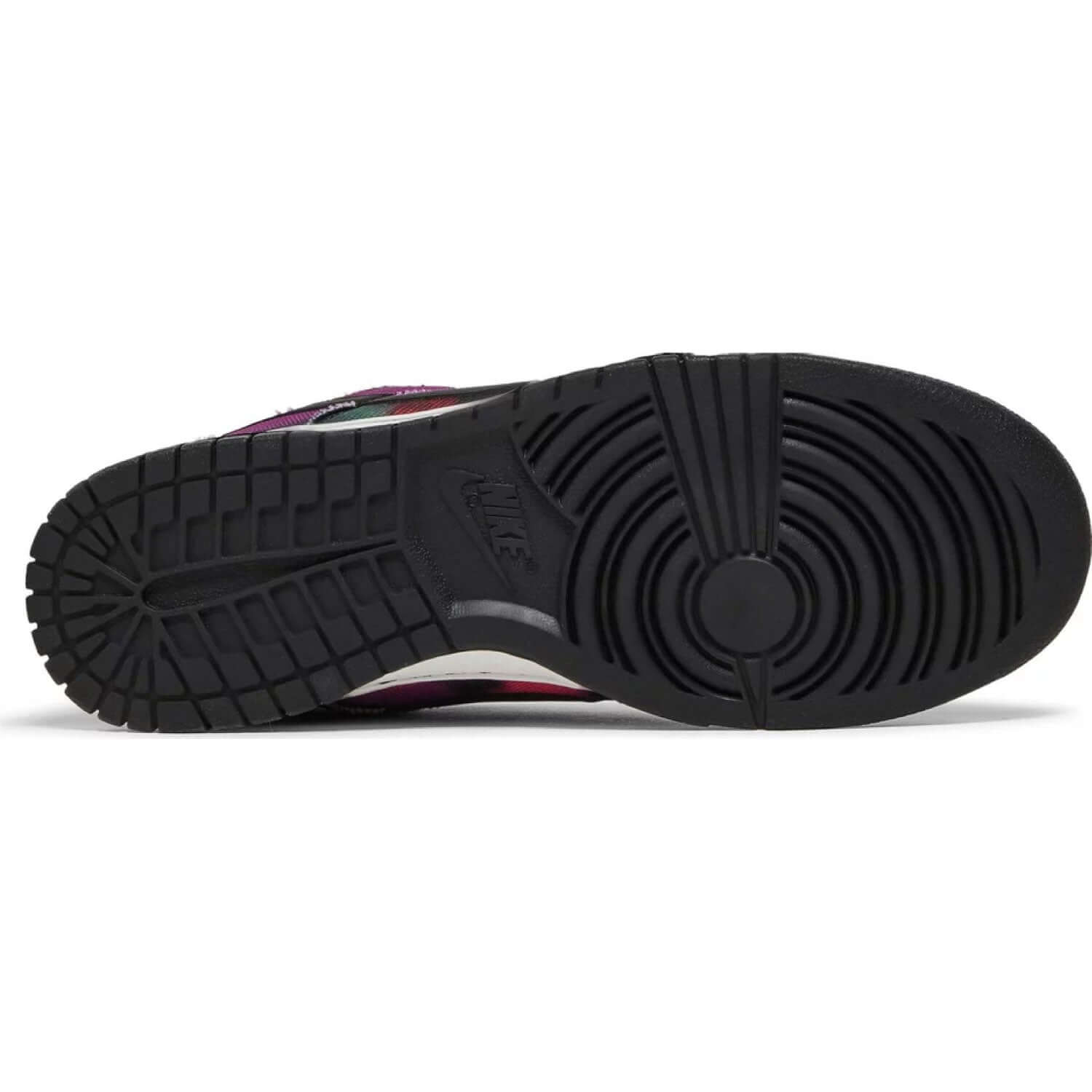The Dunk Low Graffiti Pink features mismatched right and left shoes, each with a canvas upper with a perforated toebox and a mottled pattern of pink, purple, green, black, and red. The toe cap, eye stays, forefoot, and collar overlay of the same mottled canvas with frayed edging. The leather swoosh, laces, sock lining, and tongue tag and swoosh are all black. The insole is black with a white and swoosh superimposed over a white "Pink." The midsole is white and the outsole is black.