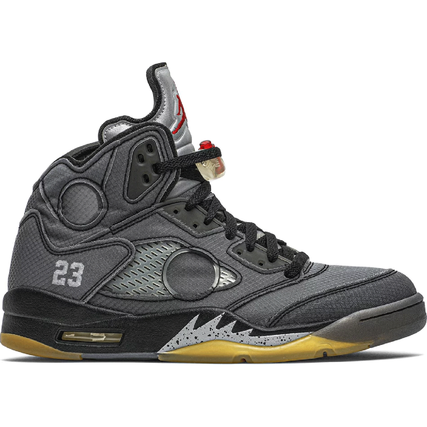 The Off-White x Air Jordan 5 SP 'Muslin' delivers Virgil Abloh’s stylized take on the retro silhouette. The faded black textile upper blends traditional details, including a silver reflective tongue and embroidered Air branding, with Virgil’s signature text on the laces and medial-side quarter panel. A pre-yellowed translucent rubber outsole adds to the sneaker’s vintage aesthetic.